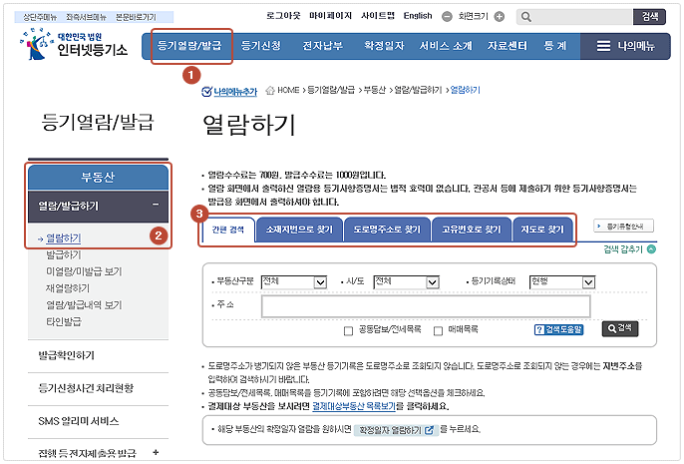 3. 다양한 방법으로 부동산을 검색 후 수수료를 지급하고 등기부등본을 열람하시면 됩니다.