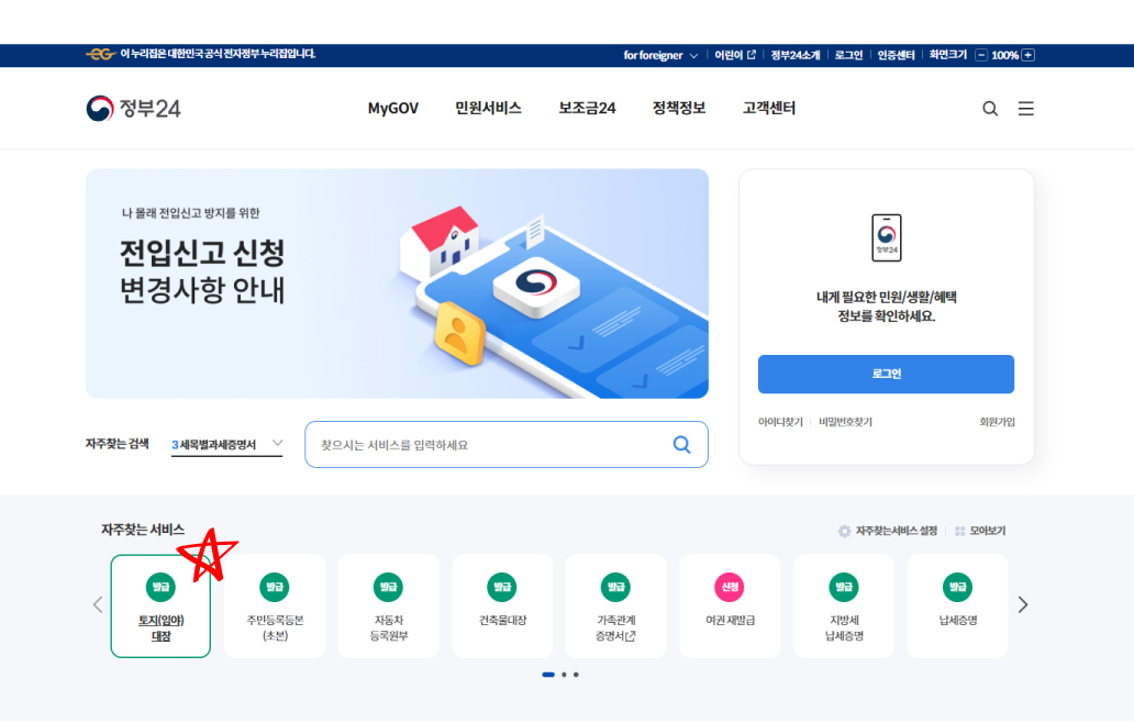 "자주 찾는 서비스 > 토지대장 > 회원 또는 비회원 신청 > 검색 > 발급"