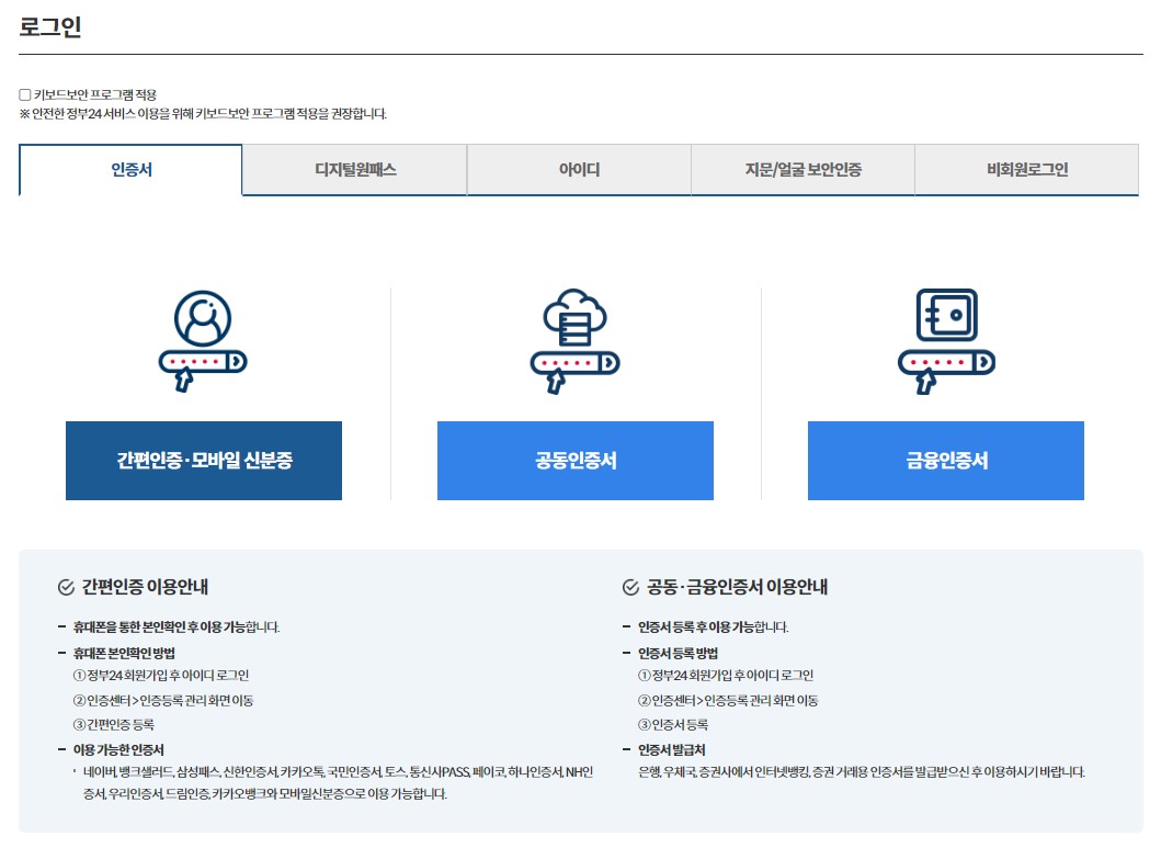 정부24를 통한 로그인은 다양한 인증서를 통해야하고,