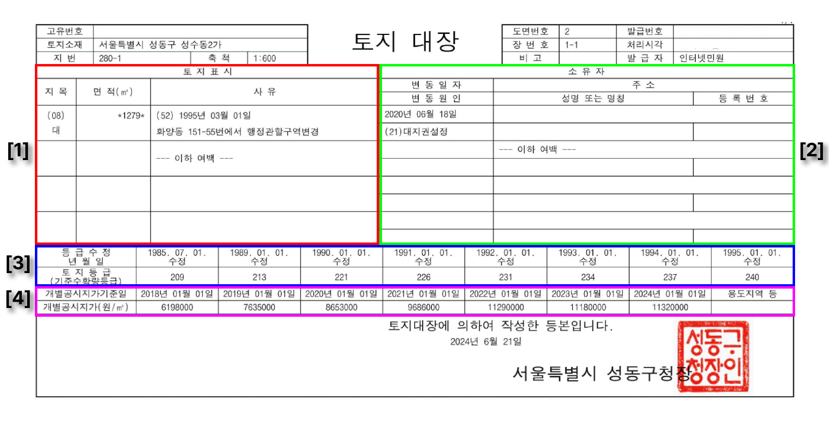 토지 등기부등본은 권리관계가 중심이고, 토지대장은 토지에 대한 객관적인 정보가 중심입니다.