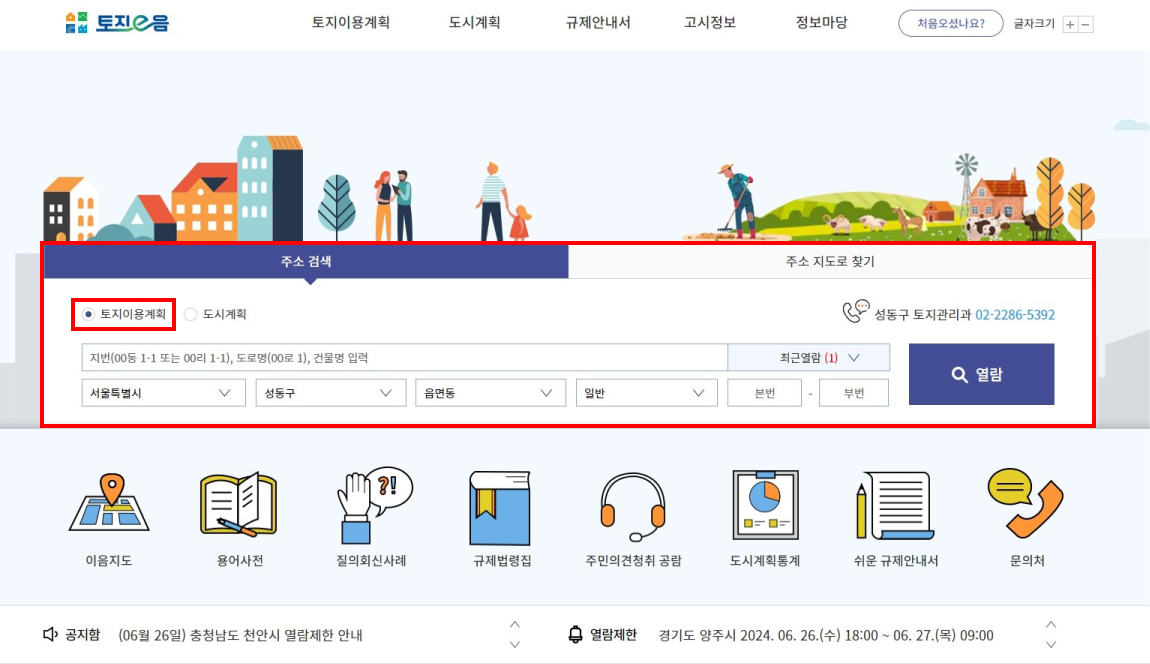 토지이용계획을 바로 조회하실 수 있도록 메인화면에서 검색이 가능합니다.