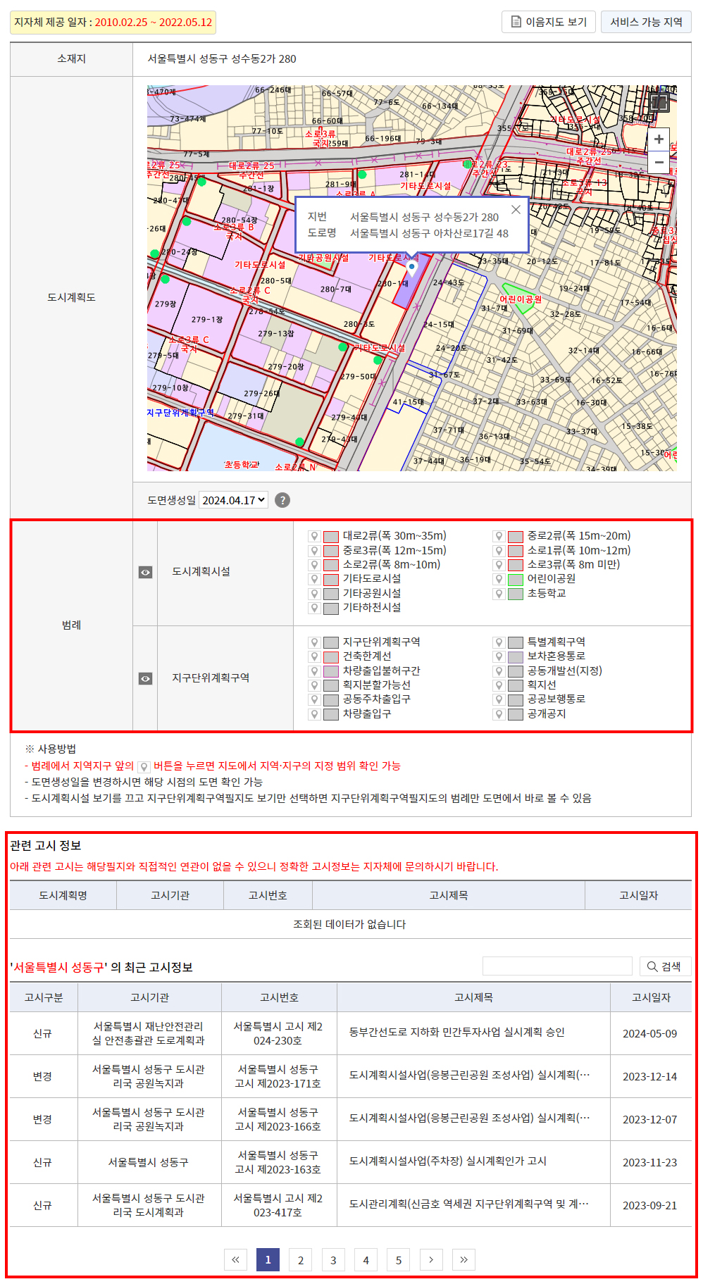 "범례"를 보시면 지도상의 주변 도시계획을 확인할 수 있습니다.