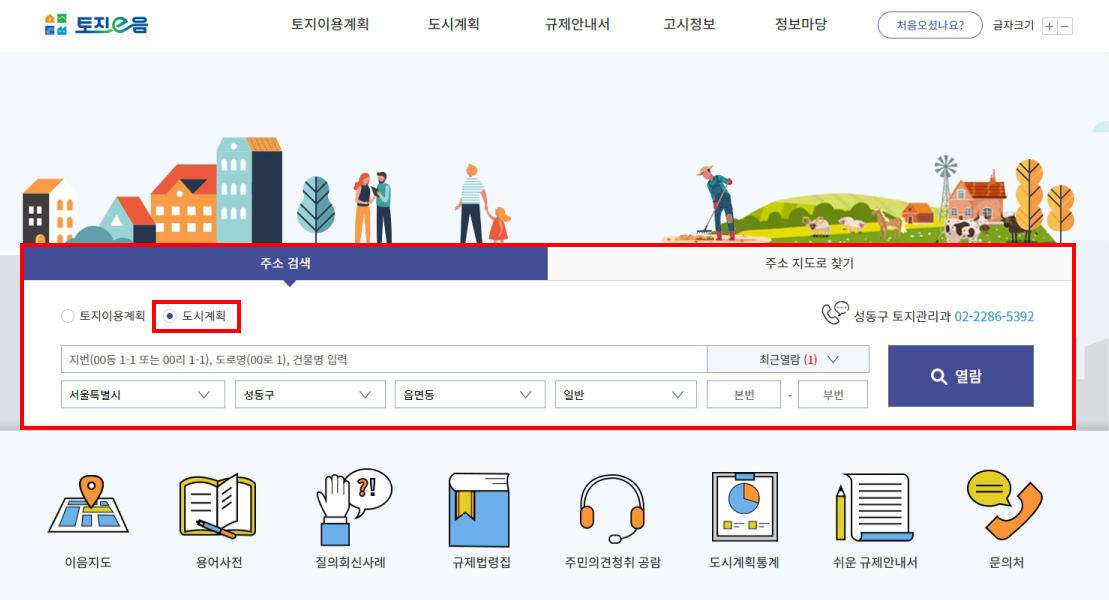 메인화면에서 "도시계획"을 선택하고 주소를 검색하시면 해당 지번의 도시계획을 바로 확인하실 수 있습니다!
