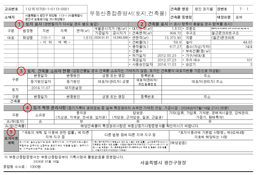 토지 및 건물의 소유권, 변동일자, 변동원인, 소유자 등의 정보를 표시합니다.