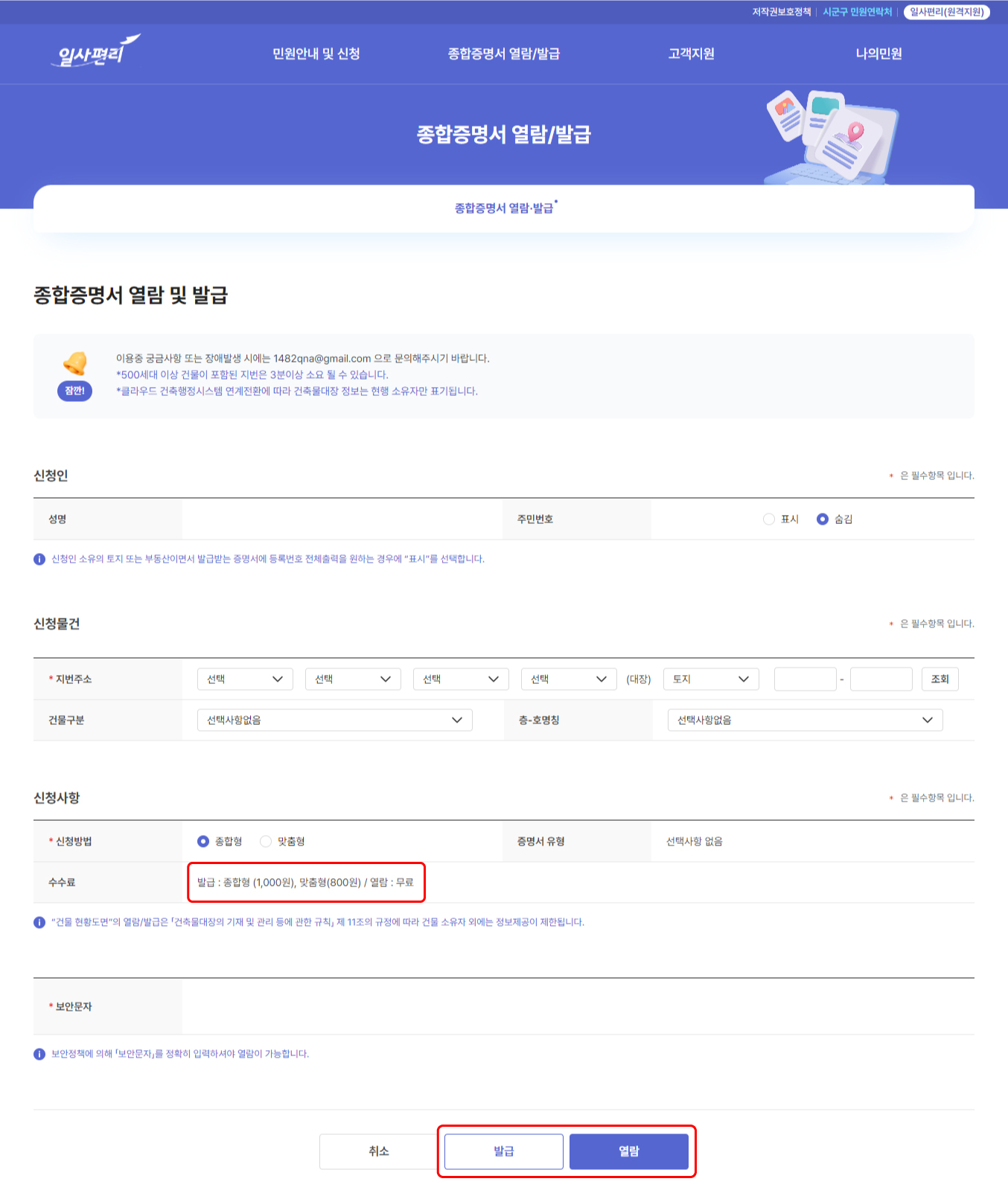 일사편리의 발급은 종합형 "1000원", 맞춤형 "800원"의 수수료가 필요하고 열람은 "무료"입니다.
