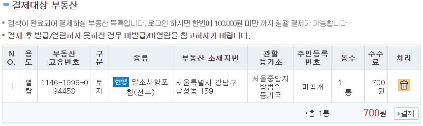 여기서 기본 열람은 700원, (법적 효력을 가진) 발급은 1,000원의 비용이 소요됩니다.