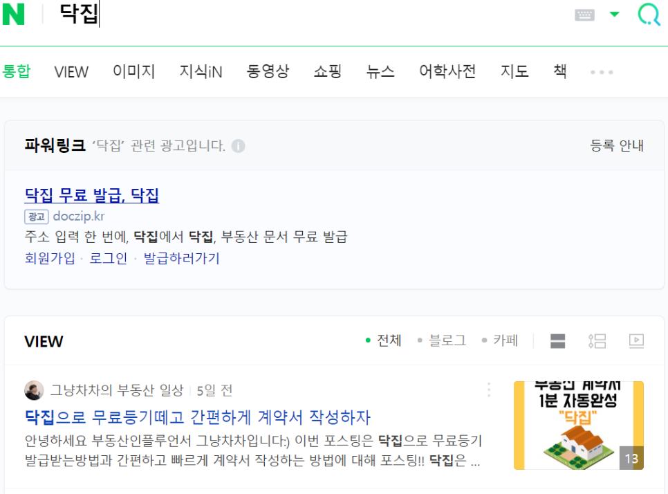 ① 네이버검색에 '닥집' 검색 및 주소 doczip.kr 입력하기