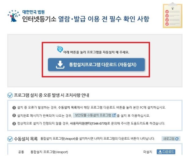 ③ 설치 완료 후 홈페이지 메인 화면에서 [부동산 등기 열람하기] 클릭