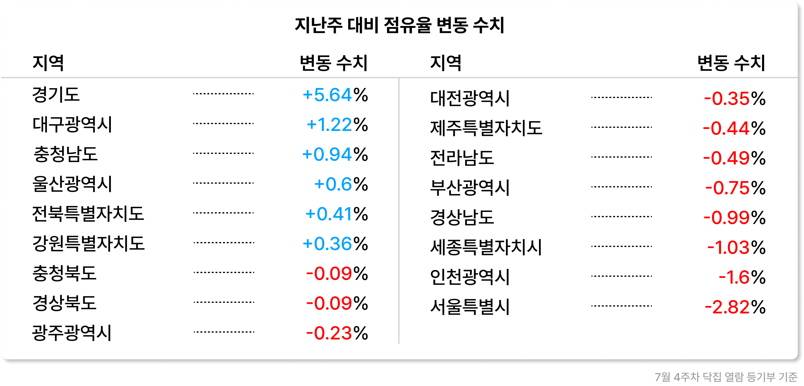 7월 3주차까지는 서울특별시가 경기도를 포함한 여러 지역의 점유율을 흡수하는 느낌이었으나
