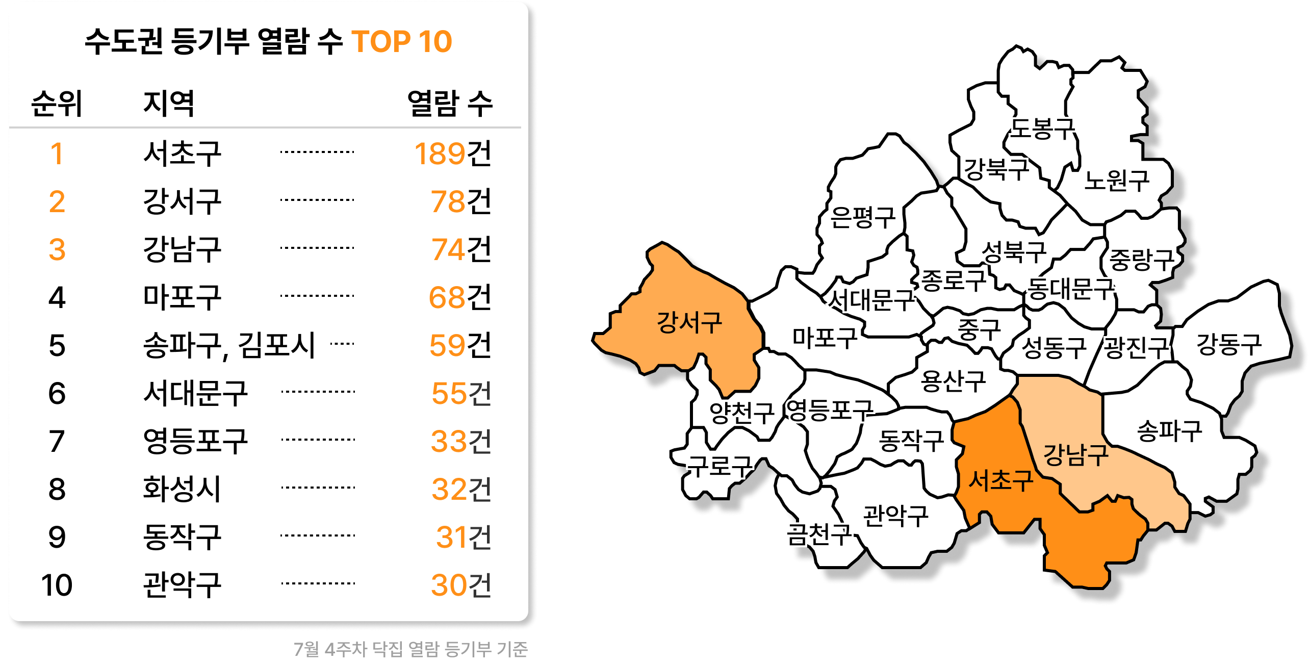 [수도권 지역별 7월 4주차 닥집 등기부 신규 열람 수]