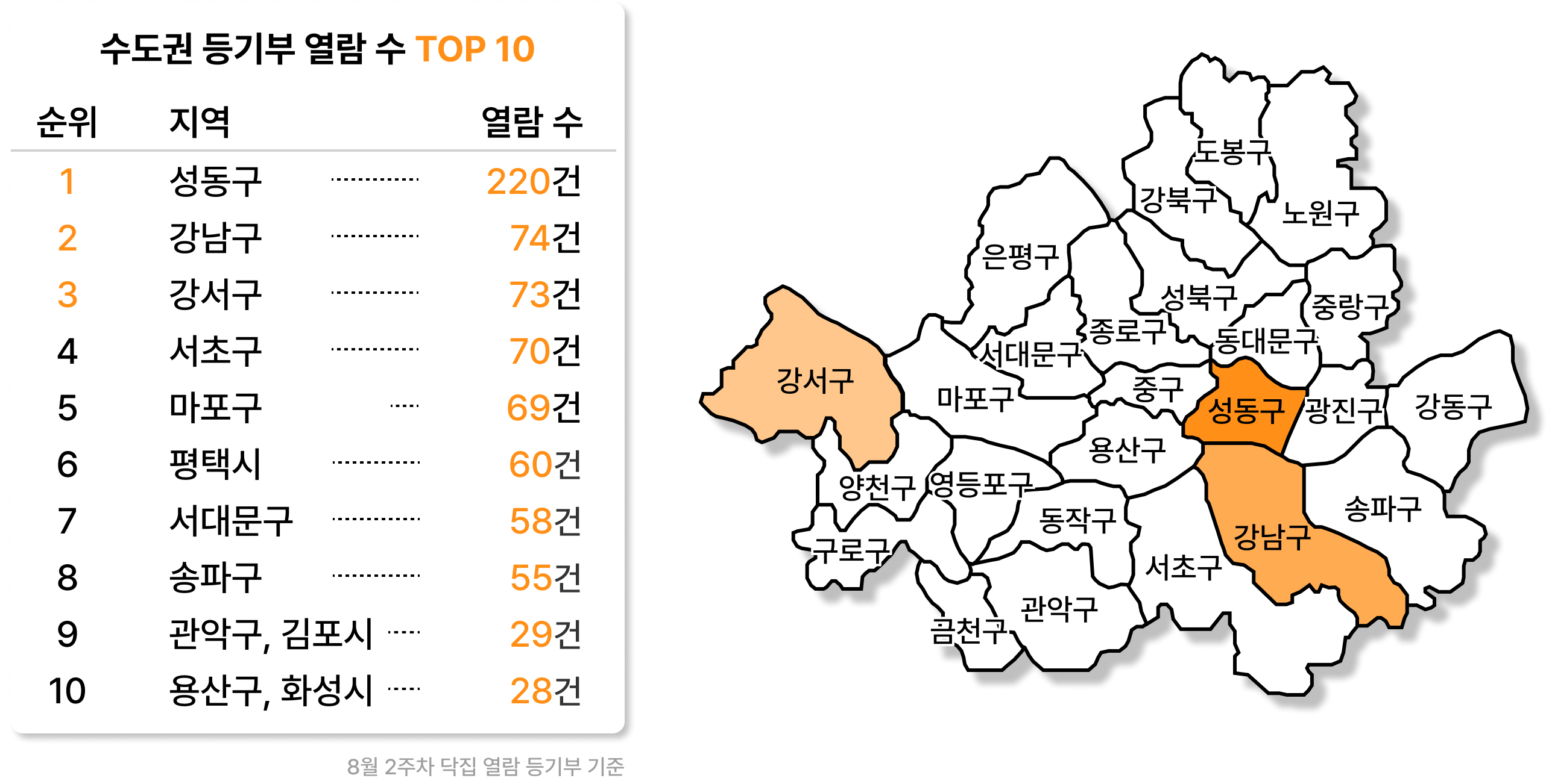 8월 2주차는 성동구가 220건의 높은 수치로 가장 많은 관심을 받은 지역이 되었습니다.