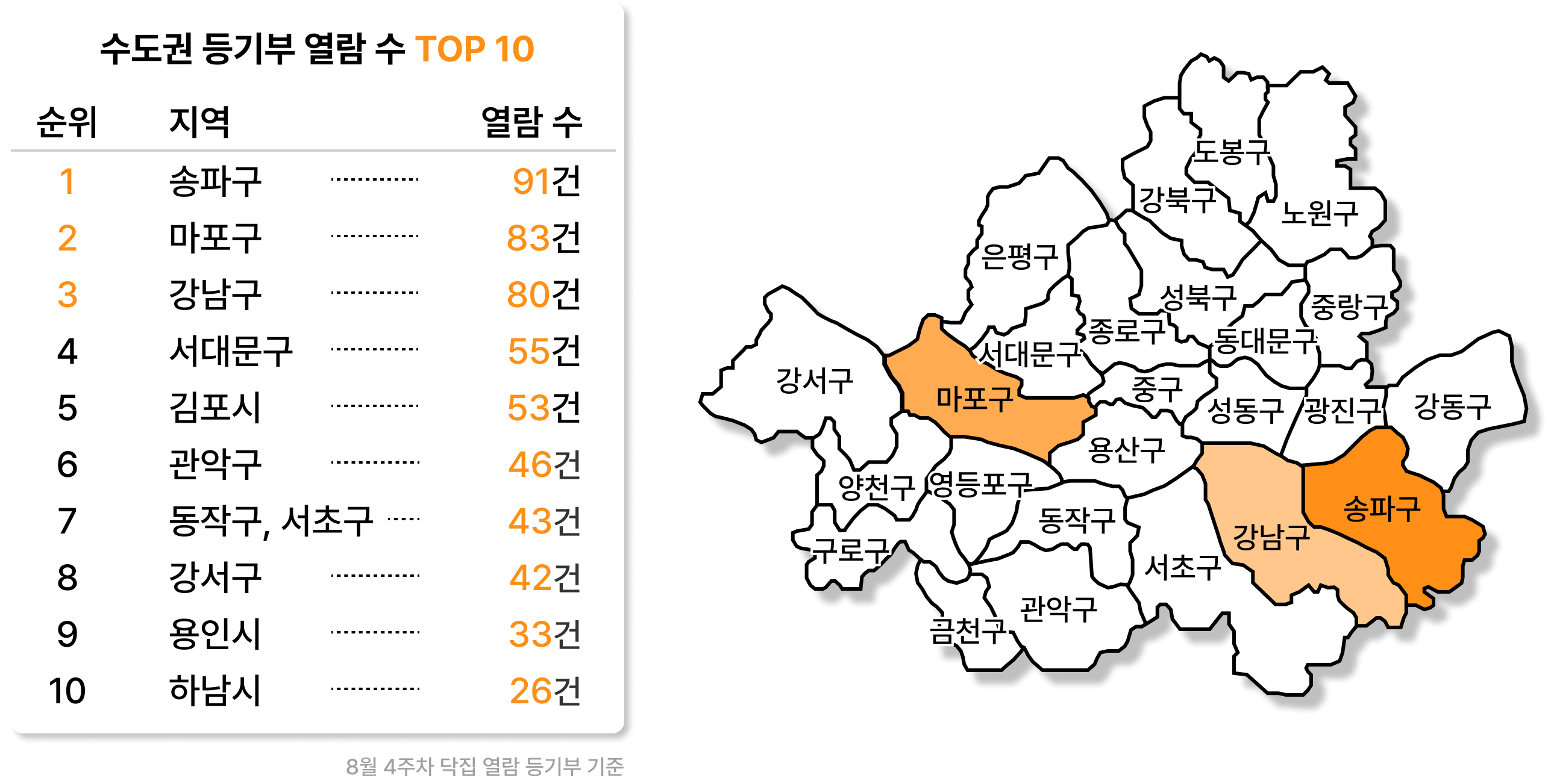 8월 4주차의 분포는 공동 순위 포함 서울 8지역, 경기 3지역이 순위권에 들어왔으며
