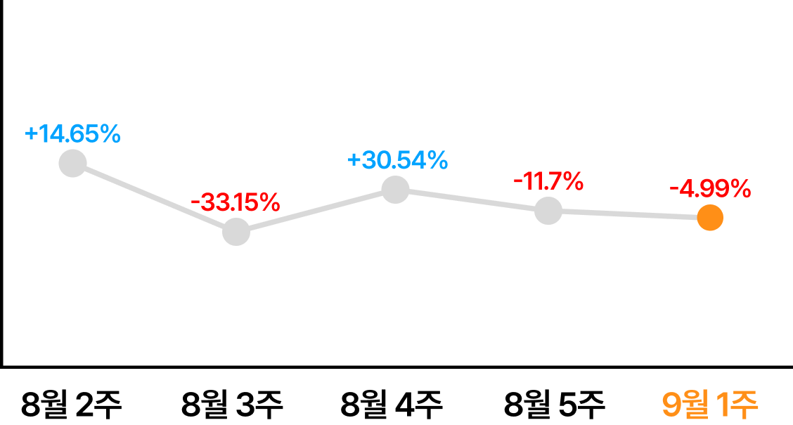 9월 1주차에는 서울의 하락세와 타 수도권 지역의 상승세가 나타났습니다.
