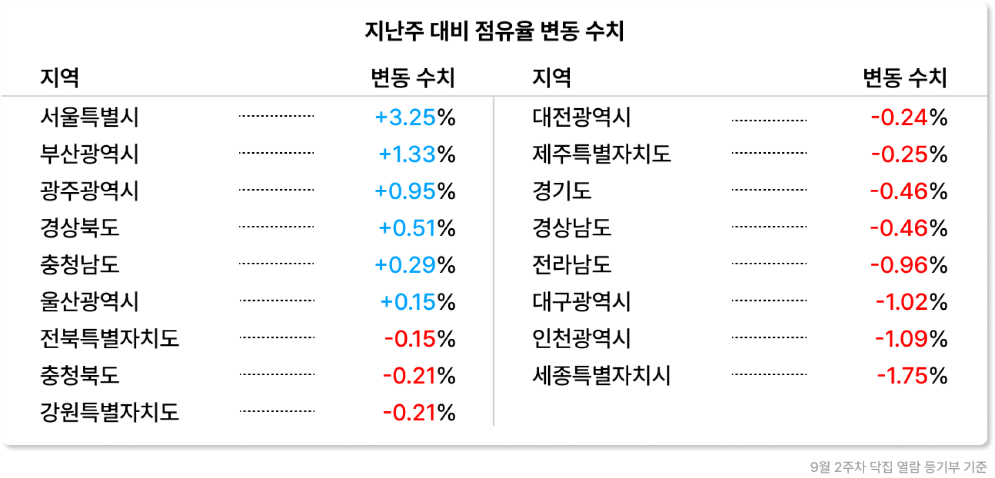 9월 2주차에는 서울의 점유율 회복과 지난 주 상승한 지역의 하락이 보인