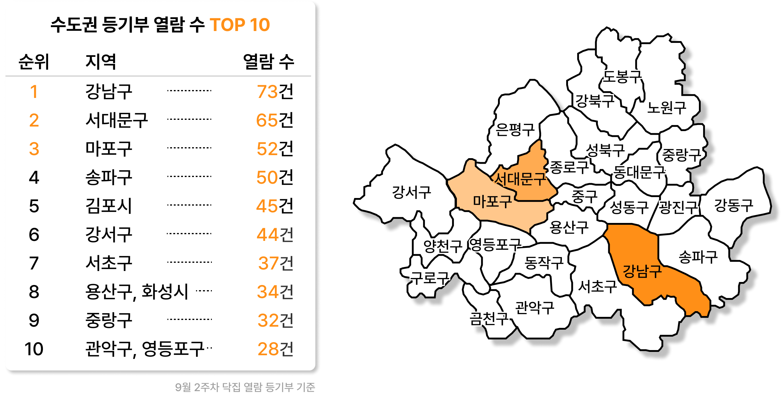 [수도권 지역별 9월 2주차 닥집 등기부 신규 열람 수]