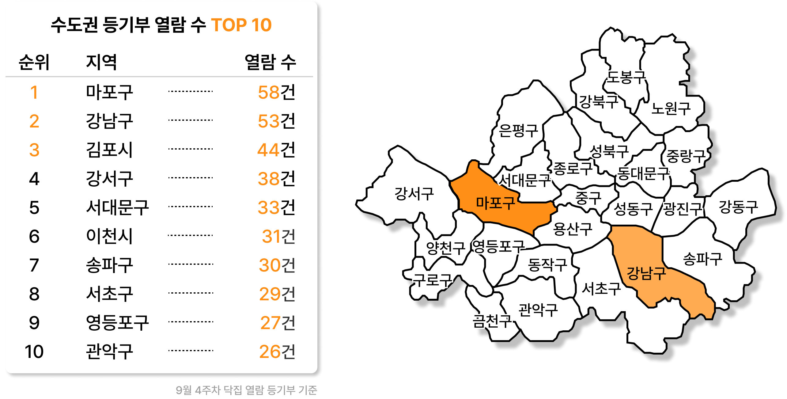 [수도권 지역별 9월 4주차 닥집 등기부 신규 열람 수]